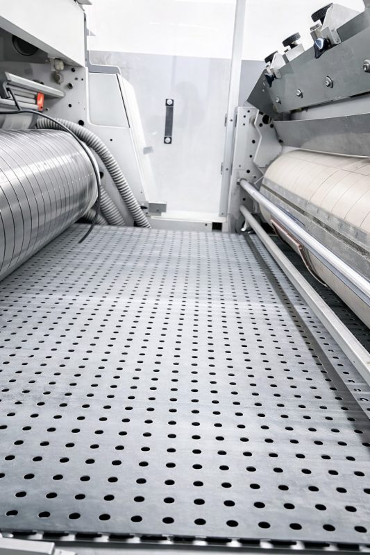 Heiber & Schröder makinelerine özel delikli konveyör bantlar, üretim performansını artırmak için optimize edilmiştir.